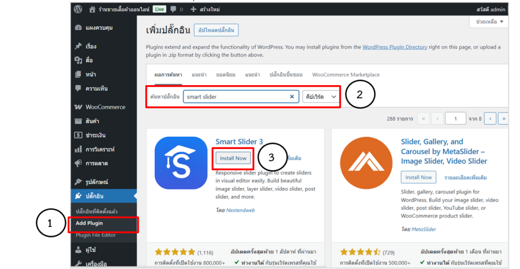 2. ที่ช่องค้นหาพิมพ์ชื่อปลั๊กอิน Smart Slider 3 โปรแกรมจะทำการค้นหาปลั๊กอินตามคีย์เวิร์ดที่ระบุ