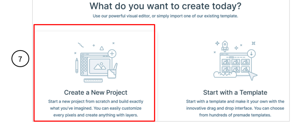 7. จะแสดงหน้าจอเลือกรูปแบบการสร้างให้เลือก คือ Create a New Project สร้างโปรเจกต์ใหม่ด้วยการออกแบบเอง Start with a Template การเริ่มต้นโปรเจกต์ใหม่โดยใช้เทมเพลต คลิกปุ่ม Create a New Project เพื่อเริ่มสร้างโปรเจกต์ใหม่ด้วยการออกแบบเอง