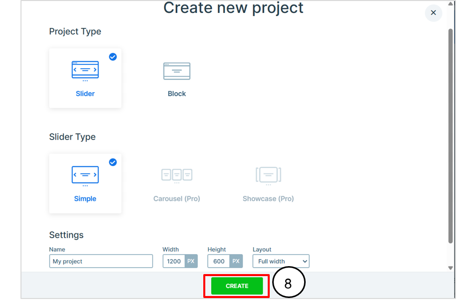 8. แสดงหน้าจอการสร้างโปรเจ็กต์ใหม่ Create new project เลือกที่ Project Type เลือก Slider     ที่ Slide Type เลือก Simple ที่ Settings ขนาดกว้าง 1200 px สูง 600 px เลือก Layout เป็น  Full width หรือ Block กดปุ่ม CREATE