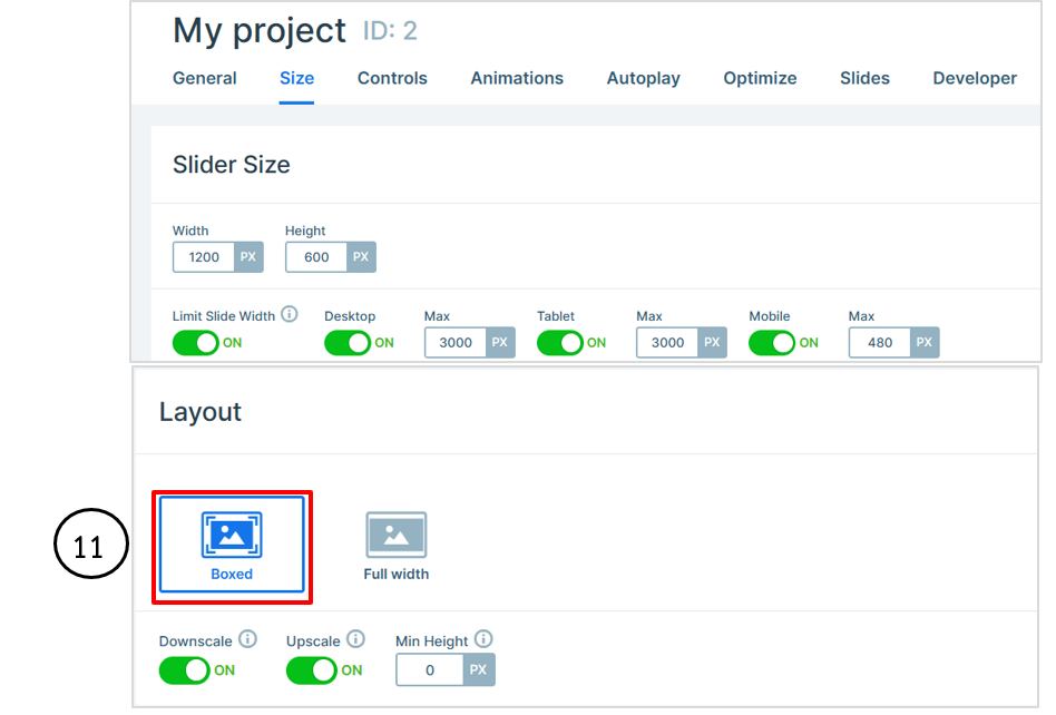 1. ที่หน้าจอ Size กำหนดขนาดพื้นที่แสดงผลของสไลด์บนหน้าเว็บไซต์ เพื่อให้สื่อมัลติมีเดียแสดงผลได้สวยงาม เหมาะสมกับอุปกรณ์ที่ใช้งาน และไม่ทำให้เนื้อหาบิดเบี้ยวหรือหลุดจากหน้าจอ Layout เลือกการตั้งค่าเป็น Boxed