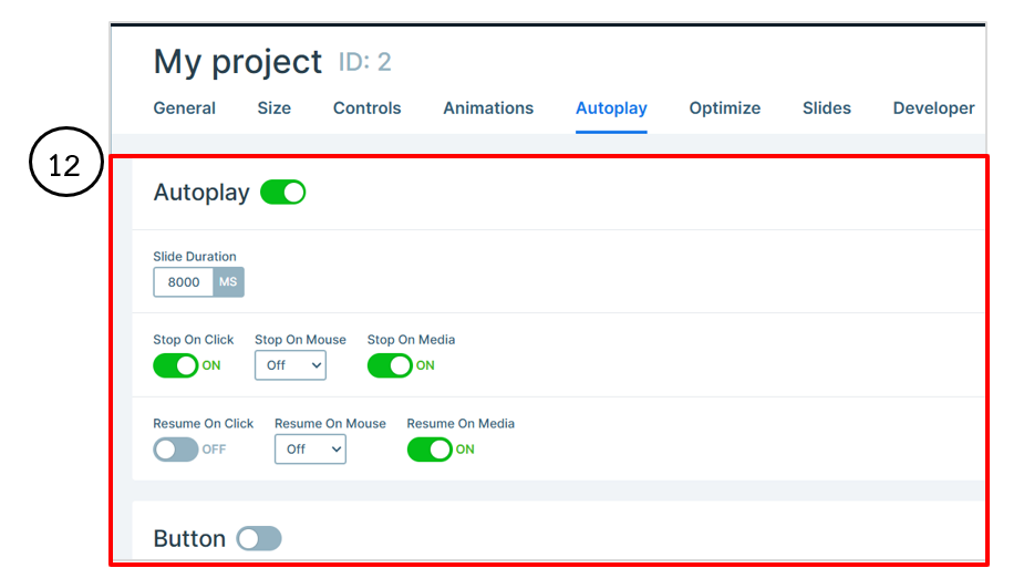 12. ที่หน้าจอ Autopay การตั้งค่า Autoplay เป็นการกำหนดให้สไลด์เปลี่ยนเองโดยอัตโนมัติช่วยให้เว็บไซต์ดูมีความเคลื่อนไหว เหมาะสำหรับการนำเสนอภาพสินค้า โปรโมชั่น หรือข้อมูลสำคัญโดยไม่ต้องให้ผู้ใช้งานคลิกเอง สามารถกำหนดส่วนต่าง ๆ เพิ่มเติมได้ดังนี้