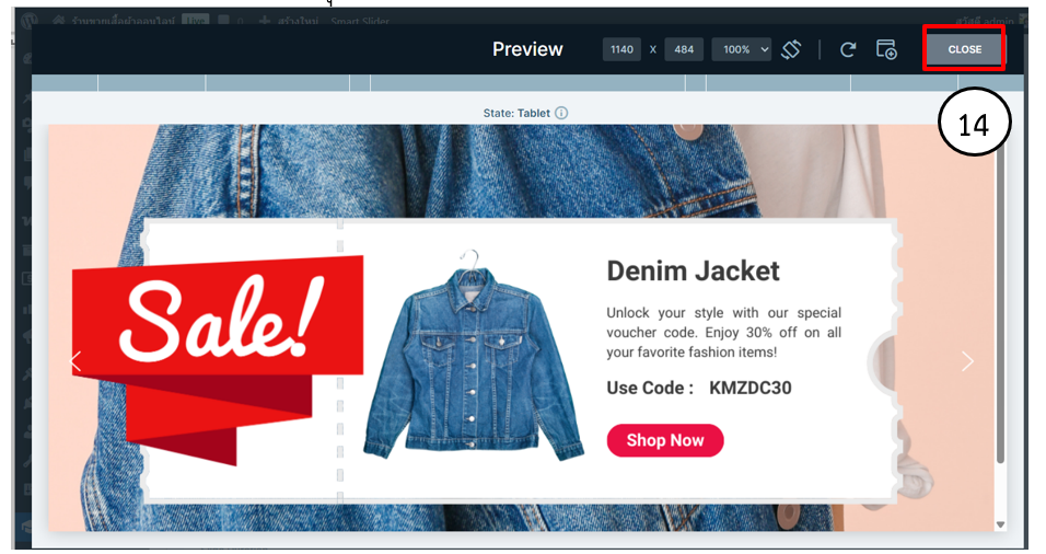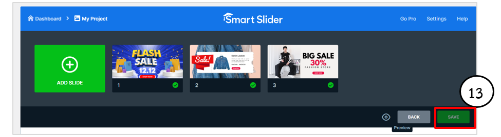 13. เมื่อตั้งค่าสไลด์เรียบร้อยแล้วคลิกปุ่ม Save เพื่อบันทึกการเปลี่ยนแปลง คลิกปุ่ม preview เพื่อดูการแสดงผลสไลด์