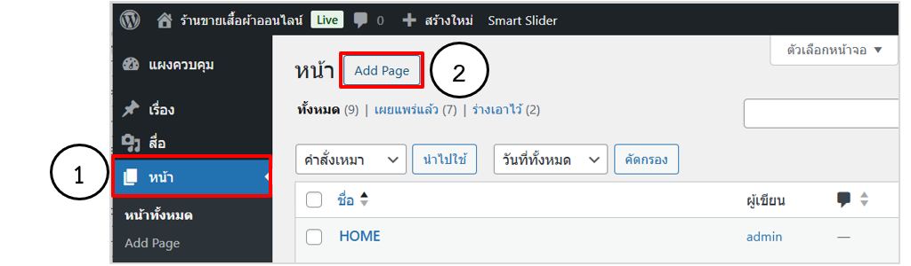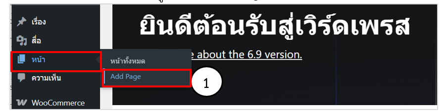 1. เข้าสู่ระบบหลังบ้าน WordPress เลือกเมนูหน้า  > Add Page