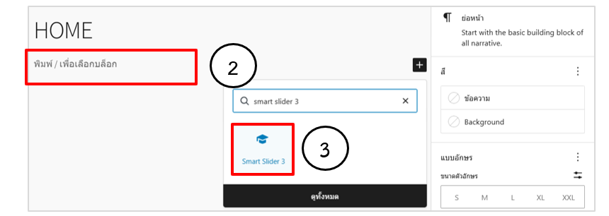 •  คลิก + ที่บล็อก พิมพ์ Smart  เพื่อค้นหาบล็อก Smart Slider 3