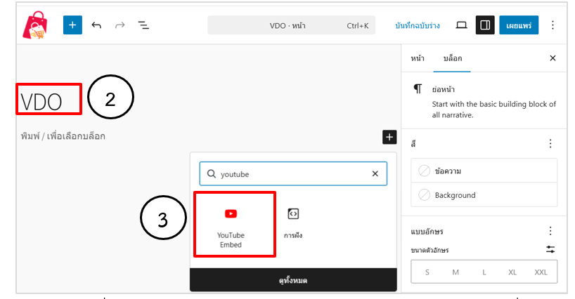• ที่ + ค้นหาบล็อก YouTube  คลิก YouTube Embed
