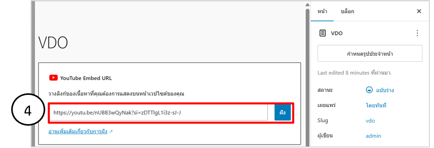 • วางลิงก์วิดีโอ YouTube ลงในบล็อกที่กำหนด กดปุ่ม ฝัง