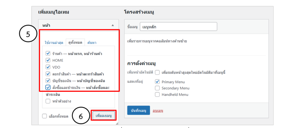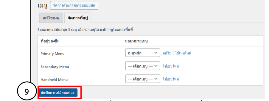 • คลิกที่แท็บจัดการที่อยู่ เมนูหลักจะอยู่ในตำแหน่ง Primary Menu กดปุ่มบันทึกการเปลี่ยนแปลง