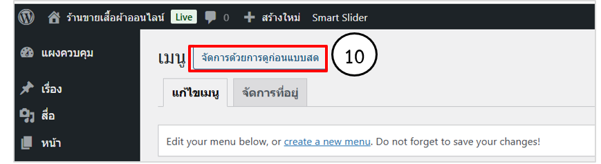 1.  การเชื่อมโยงหน้าเว็บเพจยังเมนู สามารถไปที่เมนูควบคุม เลือกรูปลักษณ์ > เมนู ที่ด้านบนคลิกปุ่ม จัดการด้วยการดูก่อนแบบสด