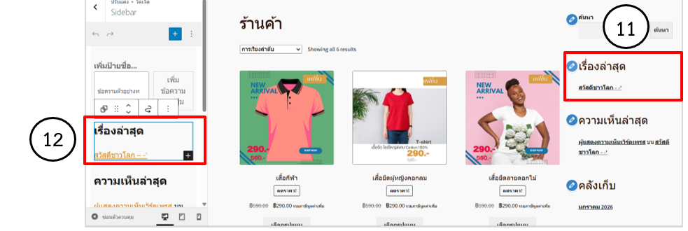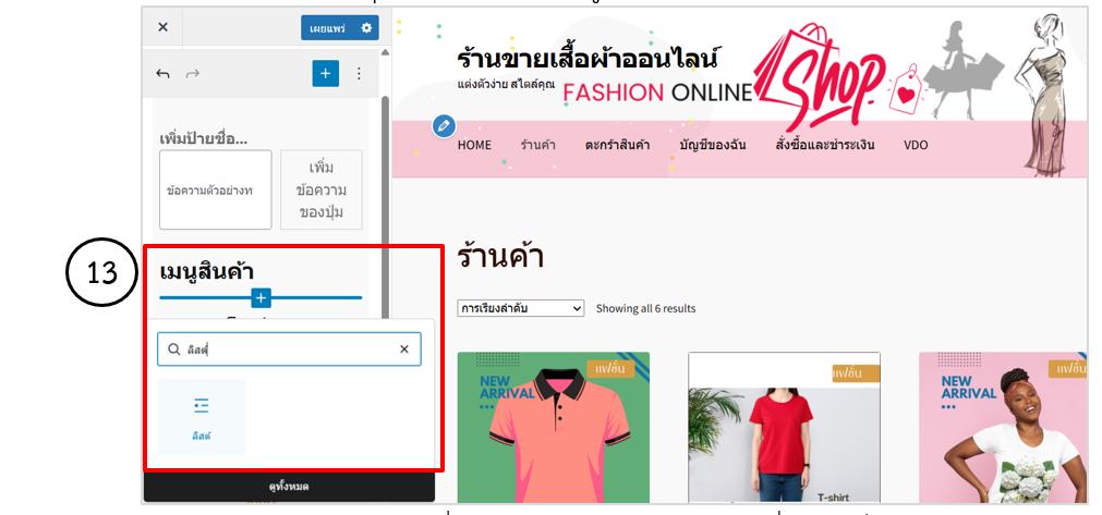 1.  ลบหัวข้อเรื่องล่าสุดออกและพิมพ์เมนูสินค้า คลิก + เพิ่มบล็อก ค้นหาลิสต์