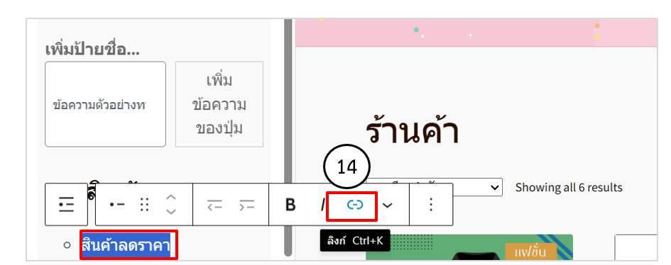 4. คลิก + เพิ่มบล็อก พิมพ์ข้อความค้นหา สินค้าลดราคา