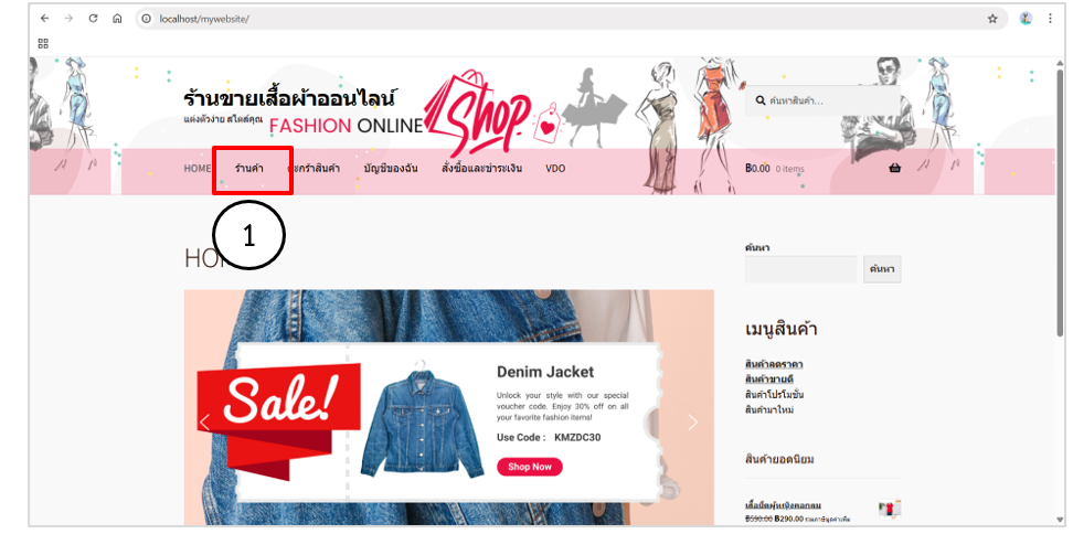 1. ตรวจสอบการแสดงผลหน้าแรกของเว็บไซต์ คลิกลิงก์ร้านค้าเพื่อตรวจสอบการเชื่อมโยงไปยังหน้าร้านค้า