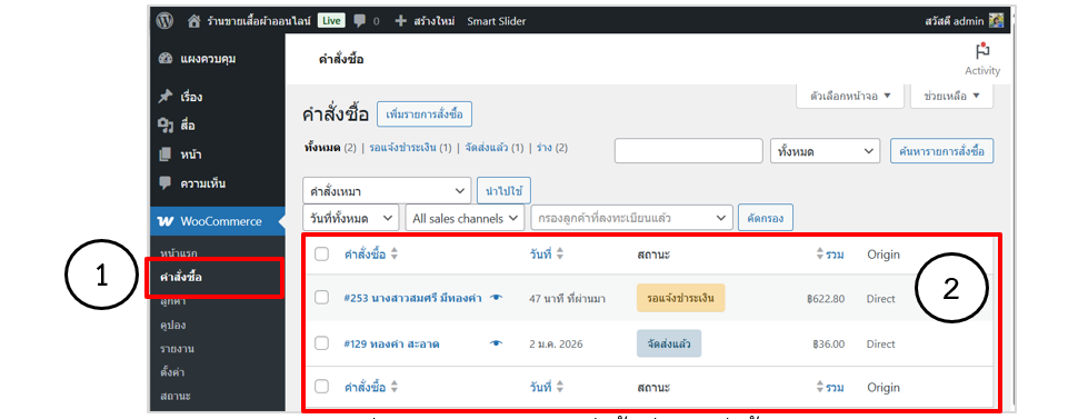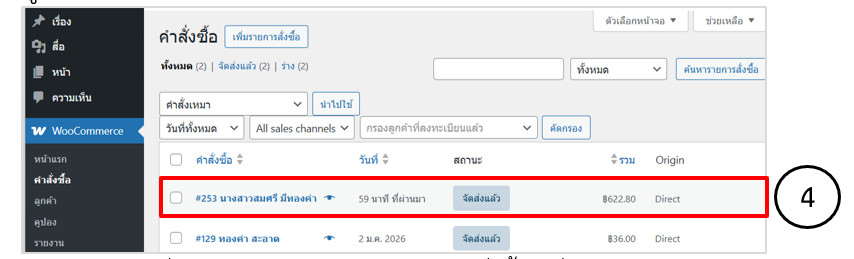 1. เข้าสู่ระบบผู้ดูแลเว็บไซต์ไปที่เมนู WooCommerce > คำสั่งซื้อ