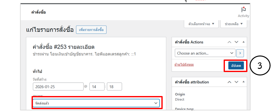 • ที่เมนู WooCommerce > คำสั่งซื้อ ตรวจสอบรายการคำสั่งซื้อเปลี่ยนสถานะเรียบร้อย