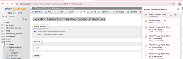 เริ่มจากการจัดการฐานข้อมูลในเครื่อง Localhost เป็นการเอาข้อมูลทั้งหมดจากฐานข้อมูล sisaket_products ออกมาเป็นไฟล์ (ส่วนใหญ่เป็น .sql)