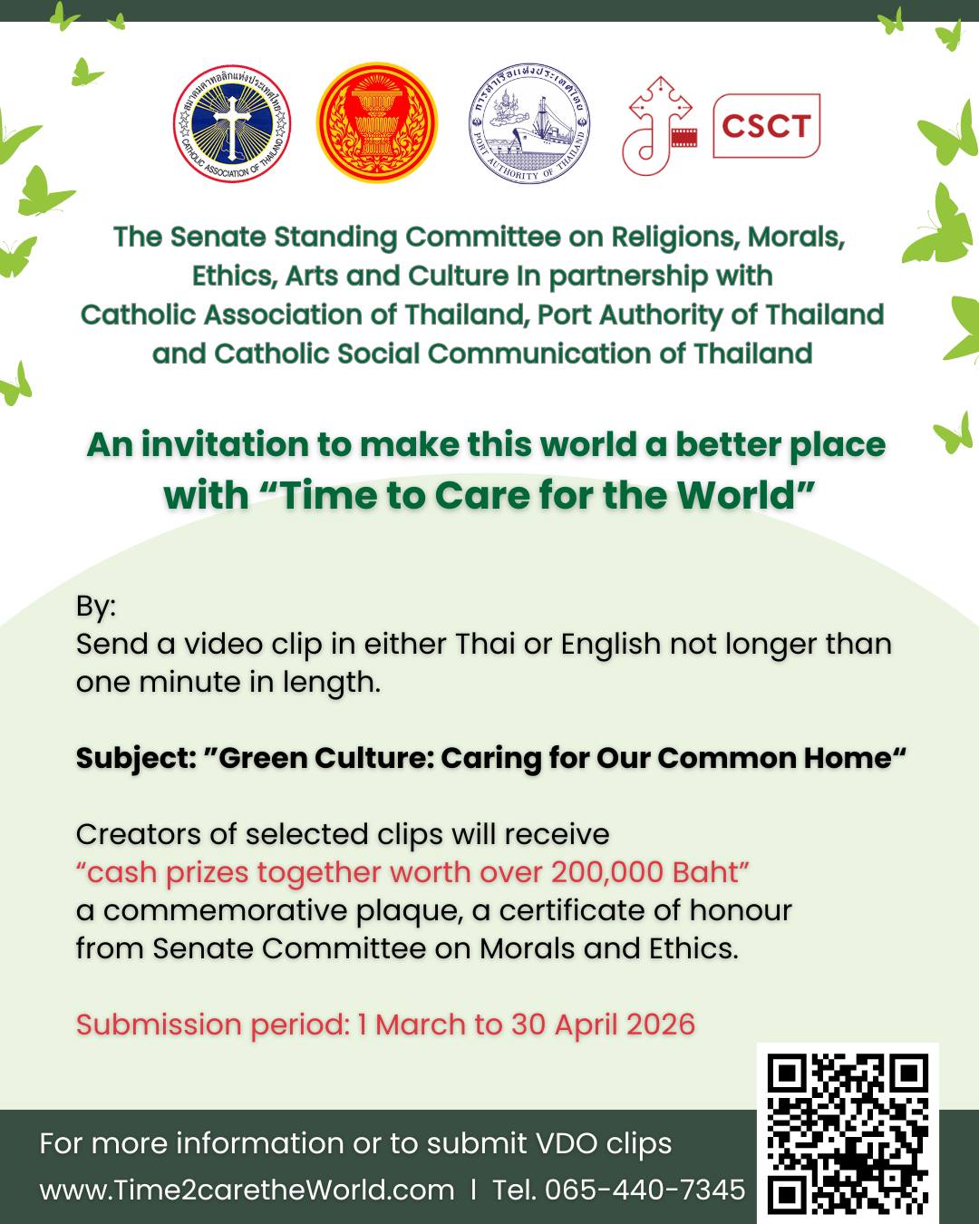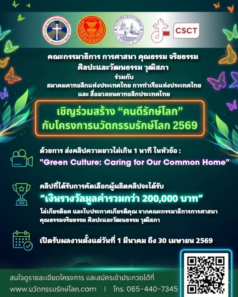 คณะกรรมาธิการการศาสนา คุณธรรม จริยธรรม ศิลปะและวัฒนธรรม วุฒิสภา ร่วมกับสมาคมคาทอลิกแห่งประเทศไทย การท่าเรือแห่งประเทศไทย และสื่อมวลชนคาทอลิกประเทศไทย ขอเชิญชวนประชาชนร่วมเป็นส่วนหนึ่งในการสร้างสังคมที่ใส่ใจสิ่งแวดล้อม ผ่านโครงการ “คนดีรักษ์โลก” นวัตกรรมรักษ์โลก 2569 🌿 ผู้สนใจสามารถส่ง คลิปวิดีโอความยาวไม่เกิน 1 นาที ภายใต้หัวข้อ “Green Culture: Caring for Our Common Home”